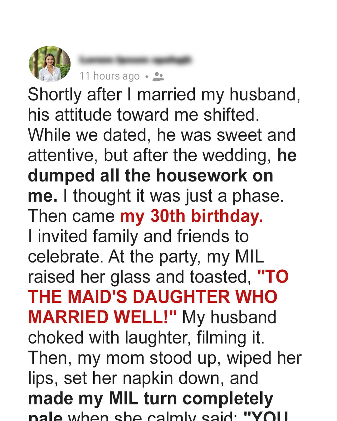 During my 30th birthday, my MIL raised a glass and sneered, “To the maid’s daughter who married well!” My husband laughed, filming it. The party froze — until my mom stood, calm and chilling, ready to reveal a truth that would shake the room and expose the cruel game they’d been playing.