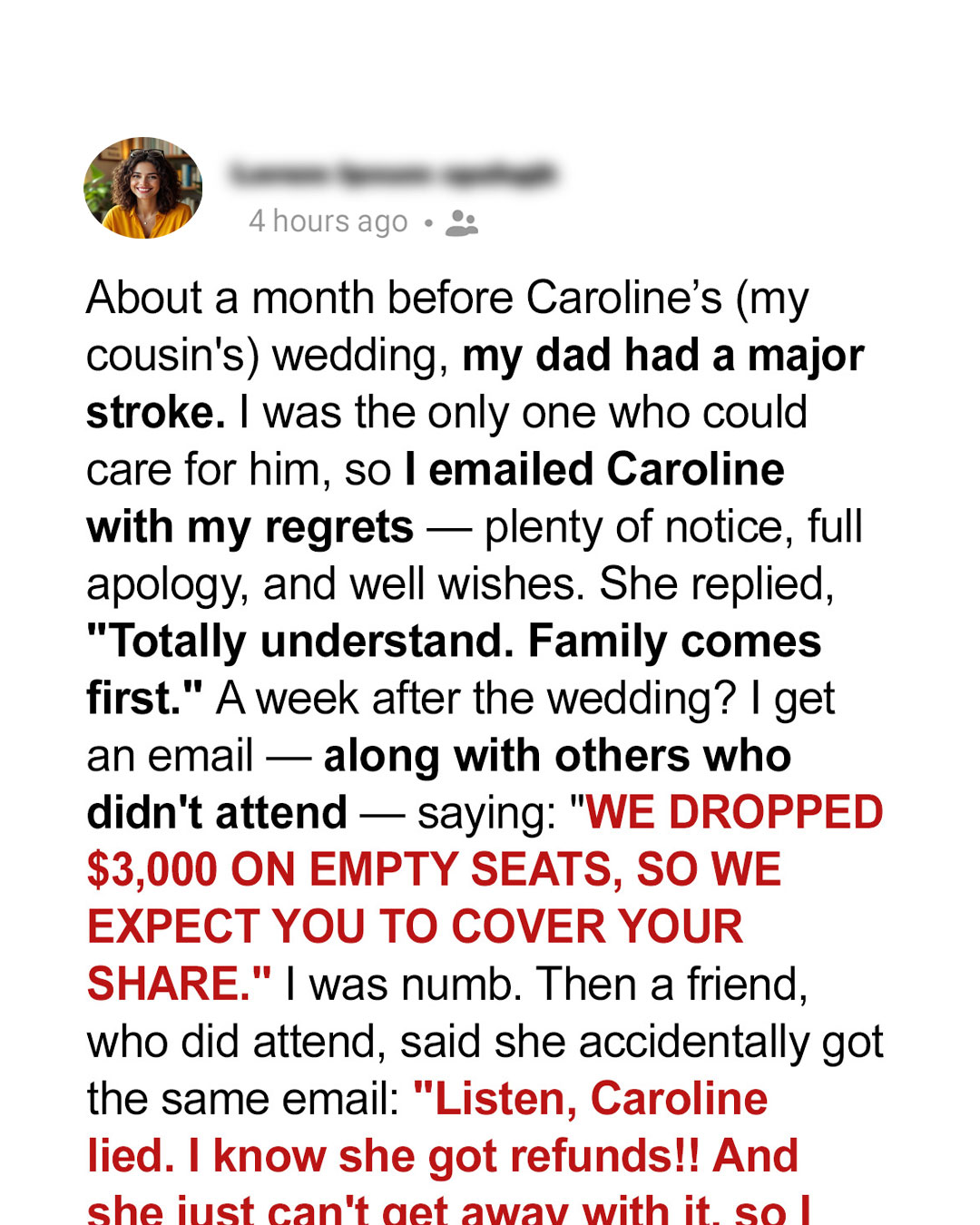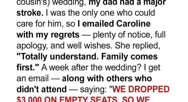 I’ve learned to be wary of people who say “family first,” especially when their actions say otherwise. My cousin claimed she understood when I missed her wedding because of my dad’s stroke. Then she sent me a bill for my “empty seat.” She wanted money but what she got was a reality check, delivered by one very fed-up guest.