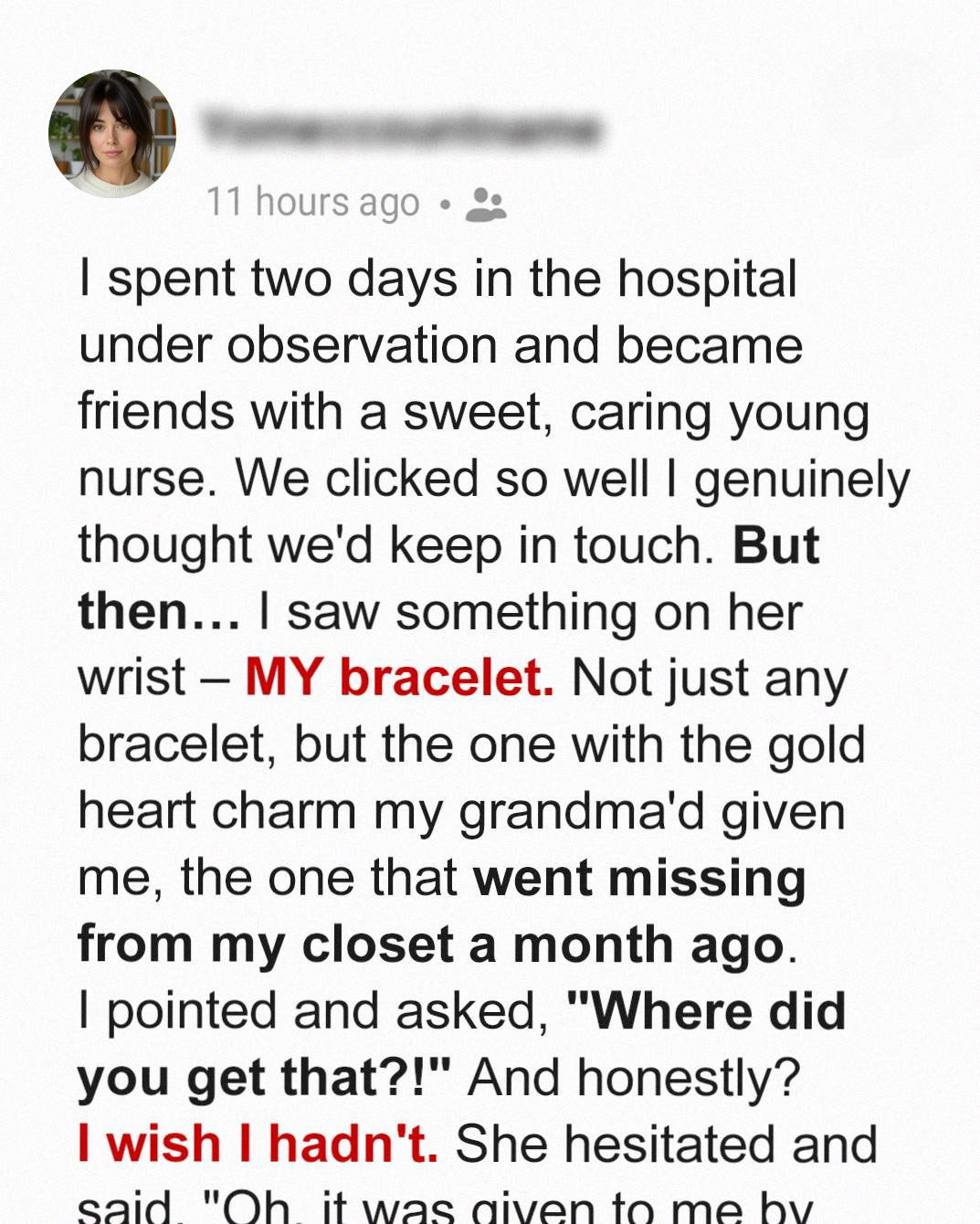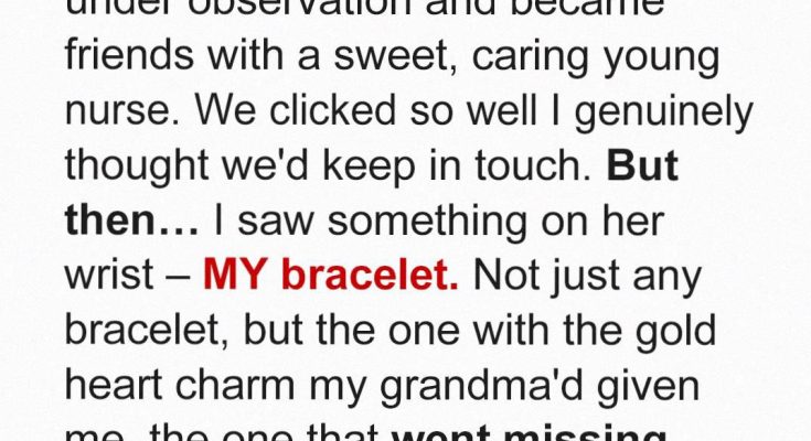 The moment my eyes landed on the delicate gold bracelet wrapped around Stephanie’s wrist, my breath caught in my throat. I knew that bracelet. I had spent weeks searching for it and was convinced it was lost forever. But now, it was on the wrist of the nurse taking care of me.