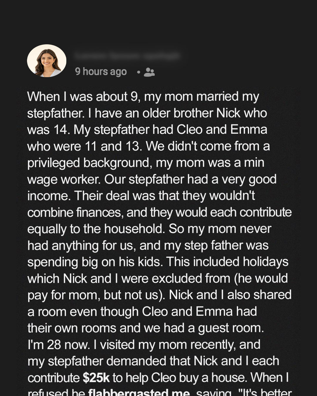 Growing up, I watched my stepdad take his daughters on vacations while my brother and I stayed home. We were never treated as equals. Years later, I thought that part of my life was behind me. But then he asked me for $25,000 to help hisdaughter buy a house.