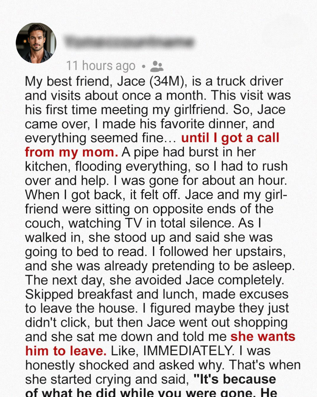 When my long-haul trucker friend came to stay, I cooked his favorite comfort meal but had to leave for an hour to help my mom. When I got back, something felt off. My girlfriend barely spoke… and the next day, she told me he had to go. What happened while I was gone turned my life upside down.
