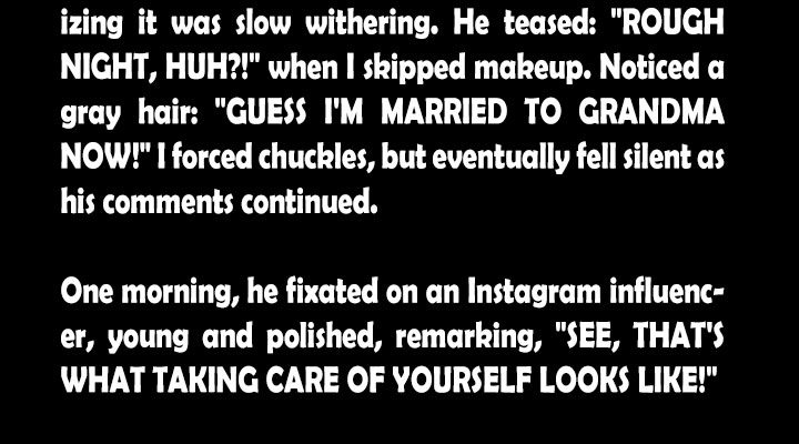 It started so small that I almost didn’t catch it. Around the time I hit my late 30s, Derek started making what he called jokes. The kind that sounded playful on the surface, like harmless teasing between a married couple. But they had this edge to them that stuck under my skin like tiny splinters.