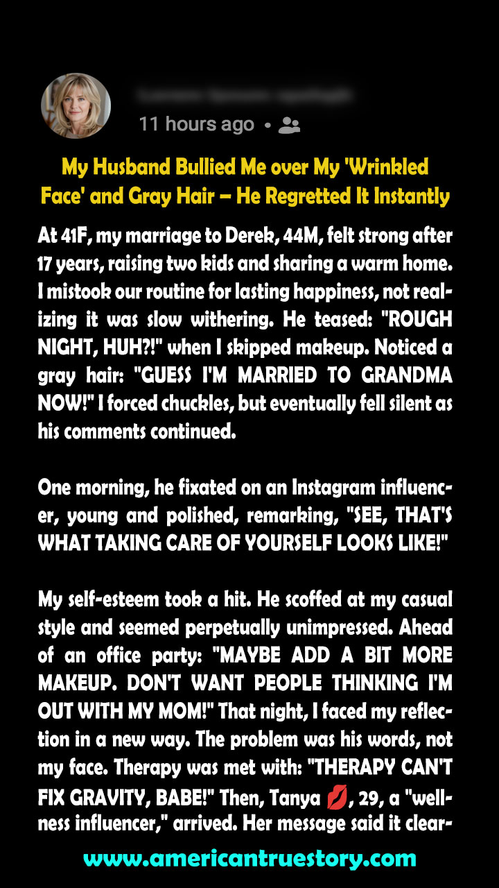 For years, Derek had mocked me for every little wrinkle, every gray hair, and every single sign that I was aging like a normal human being.