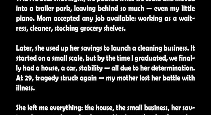At first, it was just Mom and a mop in an old van. Then she hired help. Slowly, her little cleaning business grew into something real. By the time I graduated high school, we weren’t in a trailer anymore. We had a real house with a yard and my own piano again.