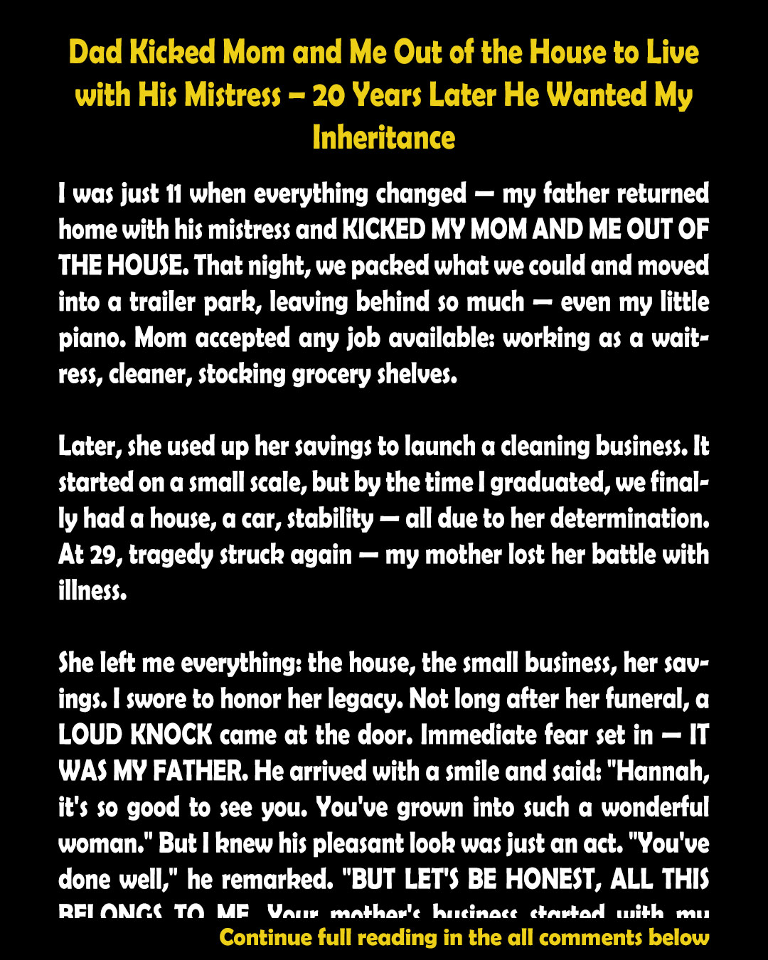 My dad chose his mistress over his family, leaving Mom and me homeless when I was 11. We struggled but never gave up, and we built something from nothing. Twenty years later, Dad showed up at my door demanding my inheritance, insisting it belonged to him. I showed him what abandonment really costs.