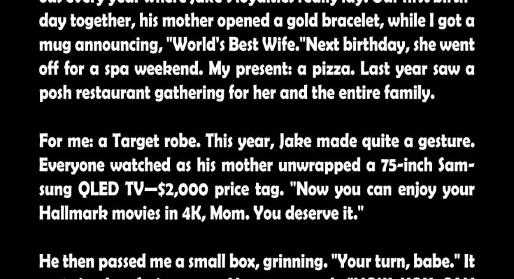 On our first shared birthday after the wedding, Jake gave his mom a beautiful gold bracelet. It had delicate links and a tiny heart charm that caught the light when she moved her wrist. For me? A coffee mug that said “World’s Best Wife” in big, cheerful letters.