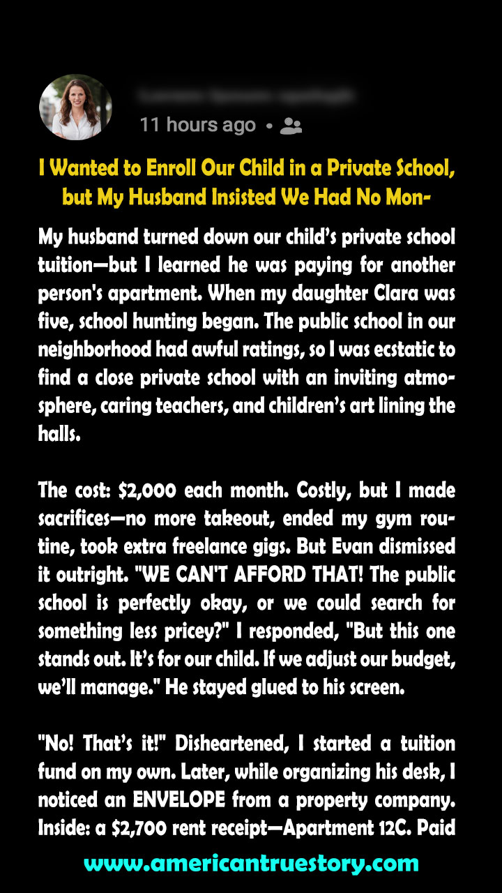 I Wanted to Enroll Our Child in a Private School, but My Husband Insisted We Had No Money—Then I Found Out He Was Paying Someone’s Rent