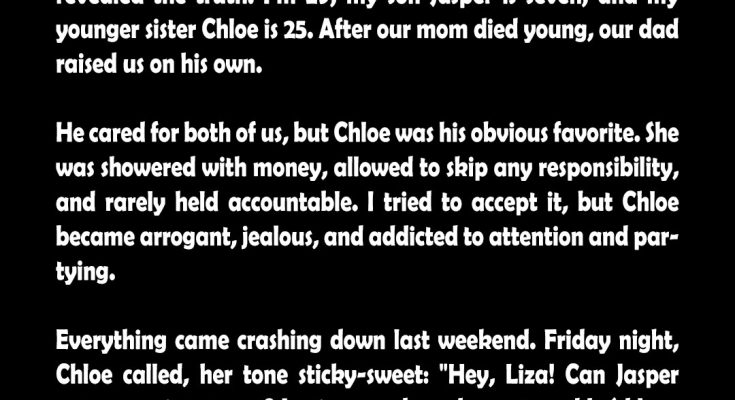 I’m 29, a single mom to my seven-year-old son Jasper, and my younger sister Chloe is 25. Our mom passed away when we were kids, so Dad raised us on his own. He did his best, but he definitely played favorites.