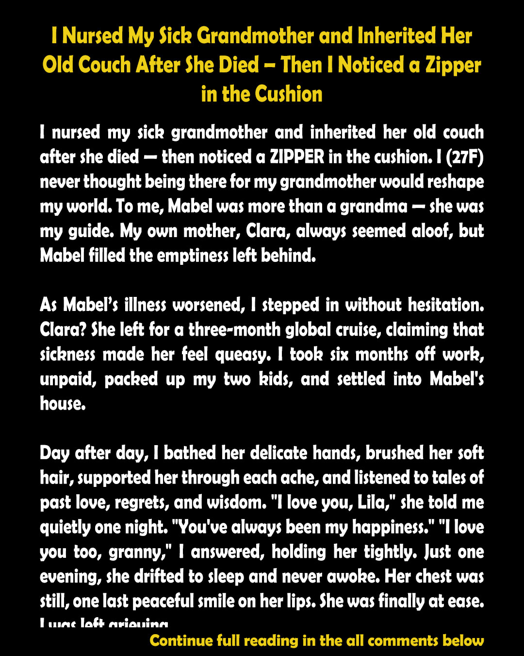 When Lila nurses her dying grandmother through her final days, she doesn’t expect to inherit more than memories. But tucked inside an old couch is a secret that changes everything, revealing the truth about love, legacy, and what it really means to be chosen.