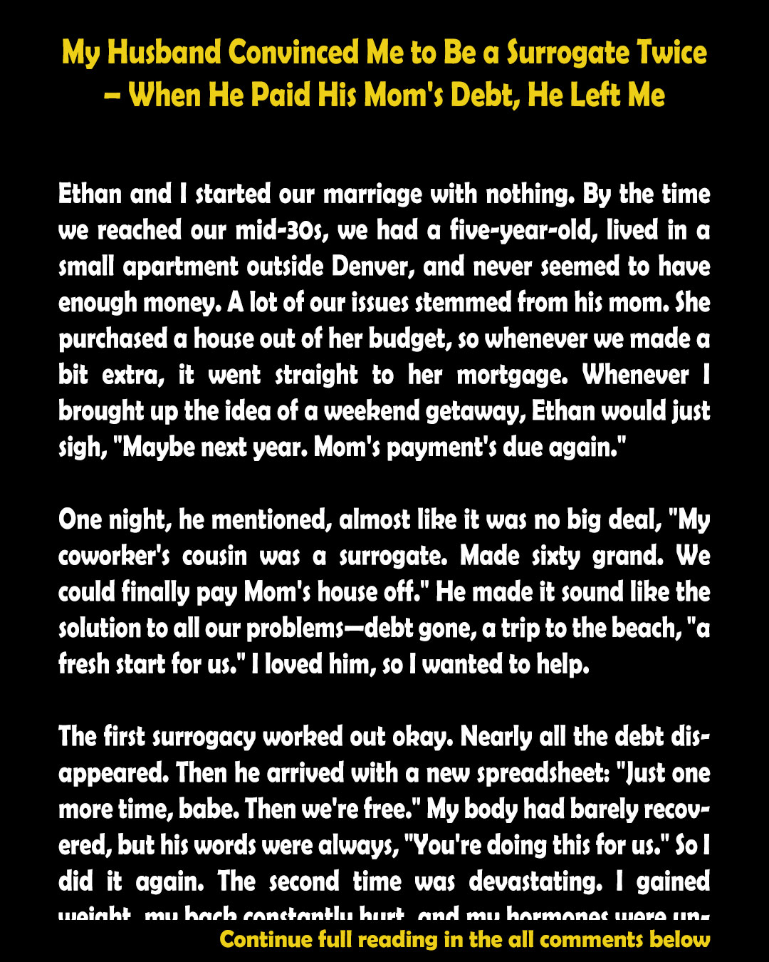My husband, Ethan, didn’t hold a gun to my head. He just held my hand while I signed the surrogacy papers; he just told me that we were doing it for us. For our son.