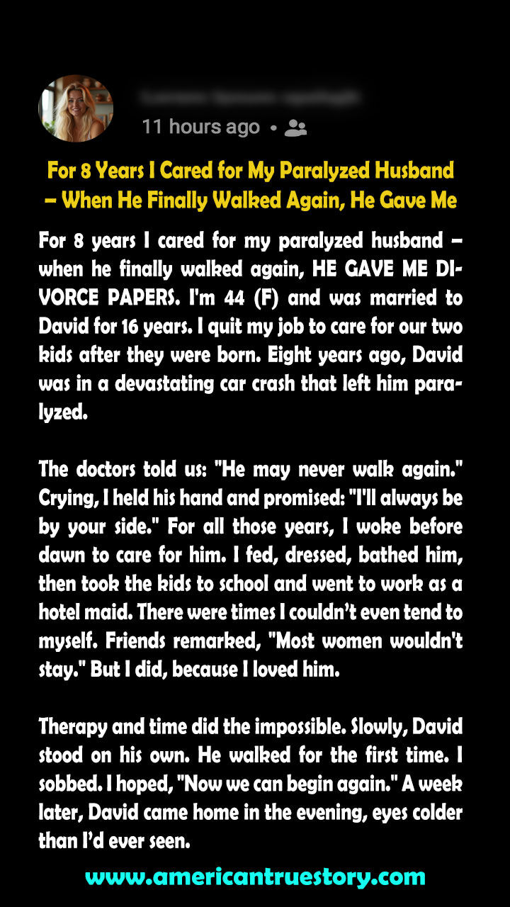 After eight years of sacrificing everything to care for my paralyzed husband, I watched him take his first steps with tears of joy streaming down my face. One week later, those same hands that had fed him, bathed him, and held him through his darkest moments were trembling as I held divorce papers and learned the devastating truth.