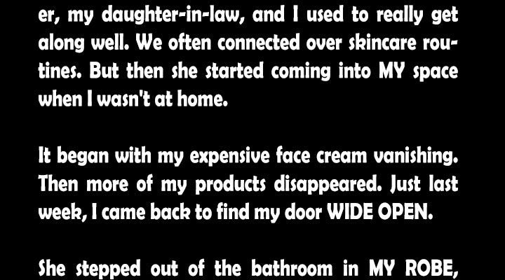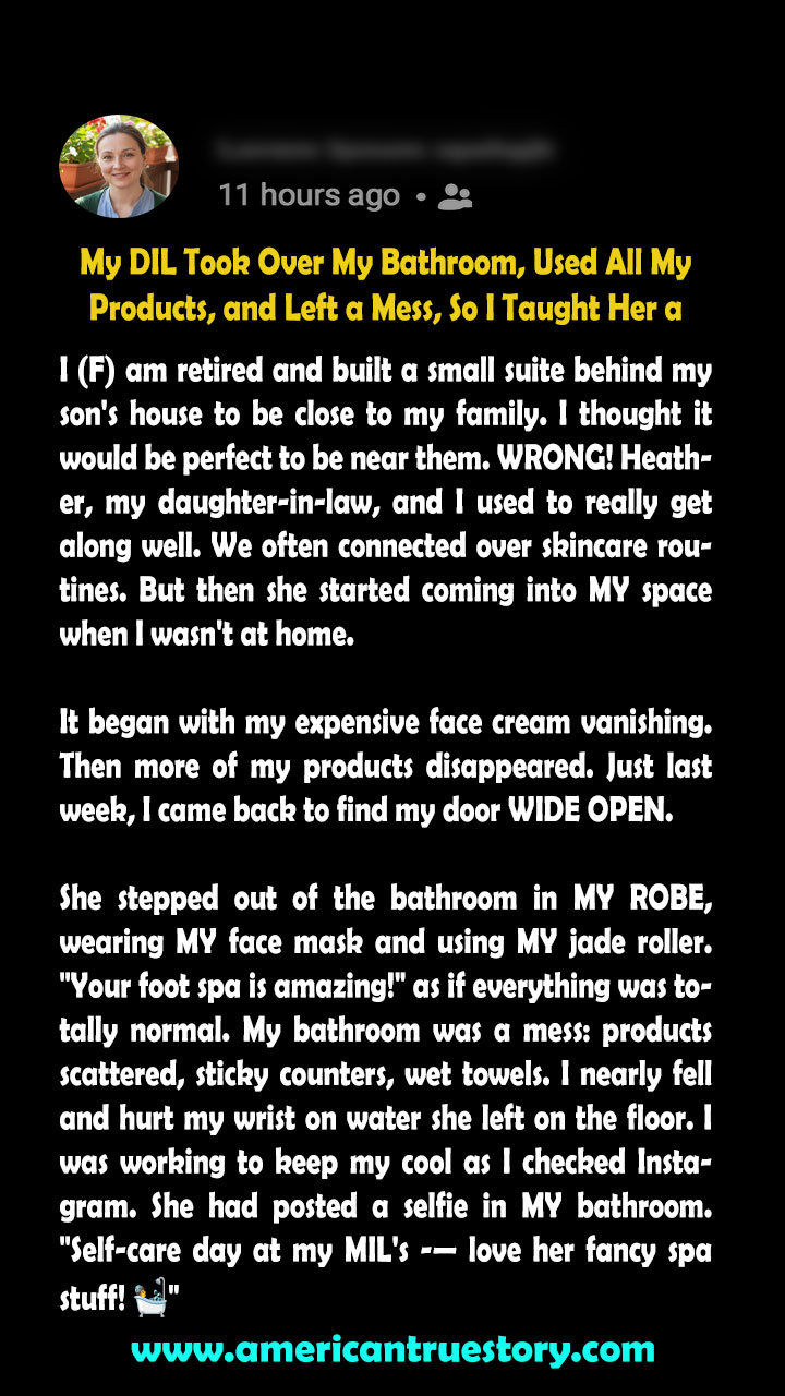 I love my daughter-in-law, but after we moved into the same property, she started treating my bathroom like her personal spa. When she used up my products and left me to clean the mess, I decided it was time she learned a little lesson in respect.