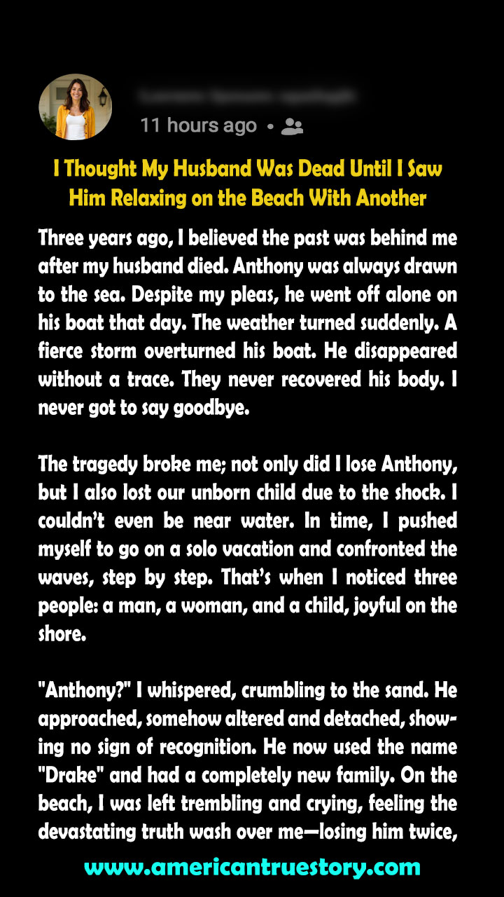 I thought I had buried my past along with my husband, who I believed had died three years ago. But on a distant beach, I saw him — alive, smiling, holding hands with a woman and a little girl. My world shattered all over again. Was it really him? And why was he with another family?
