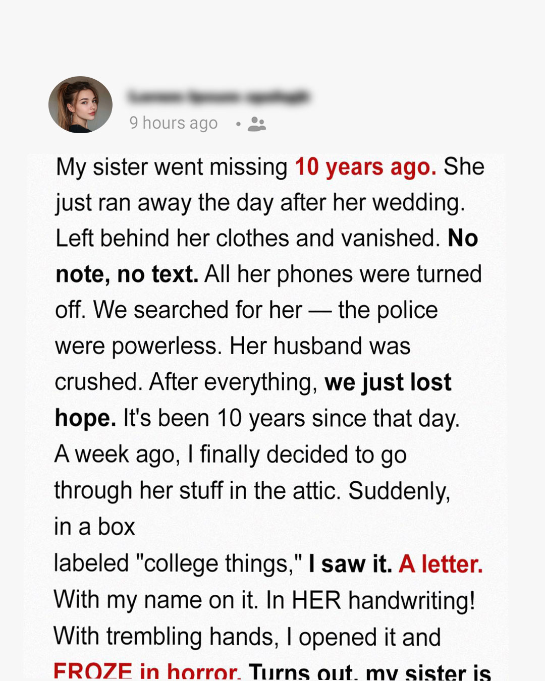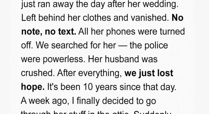 The morning after her perfect wedding, my sister vanished without a trace—no note, no goodbye, just silence. For ten years, we lived with questions. Then, in a dusty attic box, I found a letter she wrote the day she disappeared—and everything changed.