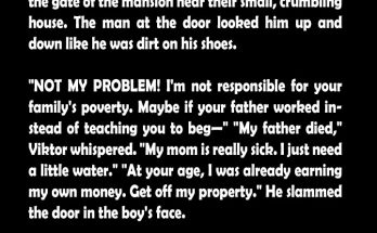 Rich Man Chased Away a Poor Neighbor’s Son Who Only Asked for Water – Ten Years Later, He Regretted ItA decade ago, a desperate ten-year-old boy knocked on a wealthy man’s door, begging for water to save his dying mother. The man’s cruel response destroyed the child’s life in ways no one could imagine. But when fate brought them face-to-face again, would the boy choose revenge or redemption? Viktor never forgot the taste of fear. It was bitter, like the medicine his mother couldn’t swallow without water that terrible afternoon. A glass water | Source: Pexels A glass water | Source: Pexels He grew up with very little, but what he lacked in possessions, he made up for in love. His childhood home was a small, weathered house with peeling paint and creaking floorboards, but it was filled with warmth. That all changed the day his father died. The car accident happened so suddenly that Viktor barely had time to process it. One moment, his father was there, ruffling his hair and promising to take him fishing on Sunday. The next day, police officers were at their door with grim faces and quiet voices. Viktor was only seven years old. A boy standing in his house | Source: Midjourney A boy standing in his house | Source: Midjourney The loss broke something in Mara, his mother. She tried to hide it, tried to stay strong for her son, but Viktor saw how her shoulders slumped a little more each day. The bills piled up faster than she could count them. His father’s modest income had been their lifeline, and without it, they were struggling to survive. “Mom, why are you crying?” Viktor asked one evening, finding her at the kitchen table with her head in her hands. Mara quickly wiped her eyes and forced a smile. “I’m not crying, sweetheart. Just tired from work.” A woman crying | Source: Pexels A woman crying | Source: Pexels “You’re always tired now,” he said softly, climbing into the chair beside her. She pulled him close and kissed the top of his head. “I know, baby. But we’re going to be okay. We have each other, and that’s what matters most.” But three years later, even that promise began to crumble. Mara grew sick. It started with persistent coughs that echoed through their tiny house at night. Then came the fevers, the weakness, and the days she couldn’t get out of bed at all. A woman blowing her nose | Source: Pexels A woman blowing her nose | Source: Pexels Viktor became her caretaker at ten. He learned to cook simple meals, though they often burned. He fetched groceries with the few dollars she pressed into his palm, counting every cent twice. He helped her to the bathroom when she was too weak to walk alone, pretending not to notice when she cried from exhaustion. “Viktor, you’re such a good boy,” she whispered one afternoon. “You shouldn’t have to do all this.” “I want to help you, Mom,” he said, adjusting the blanket around her shoulders. “You always took care of me. Now it’s my turn.” A boy sitting on a couch | Source: Pexels A boy sitting on a couch | Source: Pexels “You’re ten years old. You should be playing with friends, not playing nurse to your sick mother.” He shook his head stubbornly. “I don’t need friends. I have you.” She smiled, though tears glistened in her eyes. “What did I ever do to deserve you?” The day everything fell apart started like any other terrible day. Mara’s medication sat on the nightstand, but their water pipe had burst during the night. Water pooled across the kitchen floor, and no matter how many times Viktor tried the tap, nothing came out except a hollow, mocking sound. A tap | Source: Pexels A tap | Source: Pexels “Mom needs to take her pills,” he said aloud, panic rising in his chest. “She needs water.” He looked out the window at the massive mansion that loomed just down the street. He had passed it countless times, marveling at its perfectly manicured lawn and gleaming windows. Rich people lived there. Rich people who probably had an endless supply of everything, including water. Viktor’s hands trembled as he walked up the long driveway. The gate was tall and imposing, but there was a doorbell. He pressed it and waited, his heart hammering against his ribs. A closed door | Source: Pexels A closed door | Source: Pexels When a man answered, Viktor forced himself to speak. “I need water, please. My mom… she’s sick. Our pipe broke, and she needs to take her medication.” The man looked down at him with cold, assessing eyes. His expensive suit was perfectly pressed, and his shoes gleamed like mirrors. Viktor suddenly felt very small and very dirty in his worn-out clothes. “Not my problem,” the man said flatly. “Please, sir. Just a bottle of water. Anything. She’s really sick.” The man’s lip curled. “I’m not responsible for your family’s poverty. Maybe if your father had worked instead of teaching you to beg at strangers’ doors, you wouldn’t be in this situation.” A man looking straight ahead | Source: Pexels A man looking straight ahead | Source: Pexels Viktor’s voice broke. “My father died. He died in a car accident. My mom is really, really sick. I just need a little water.” “At your age, I was already earning my own money,” the man sneered. “Get off my property before I call the police.” The door slammed so hard that Viktor flinched. He stood there for a moment, stunned and humiliated, before turning and running back home with empty hands and burning eyes. That night, everything got worse. Viktor gave his mother water from the emergency jug they kept in the basement, but it wasn’t enough to stop what came next. A close-up shot of a water pouring out of a bottle | Source: Pexels A close-up shot of a water pouring out of a bottle | Source: Pexels Someone knocked on their door after dark. It was a woman from child services, accompanied by a police officer. “We received a report about unsafe living conditions,” the woman 