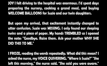 When I arrived at the hospital to bring home my wife and newborn twins, I was met with heartbreak: Suzie was gone, leaving only a cryptic note. As I juggled …